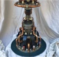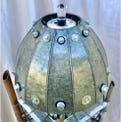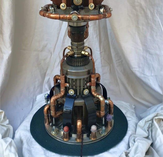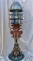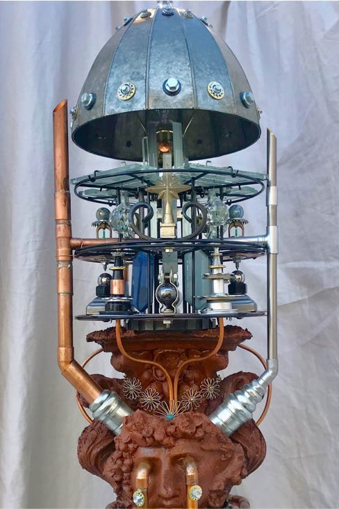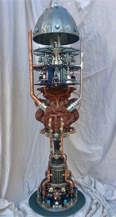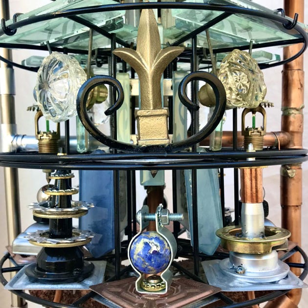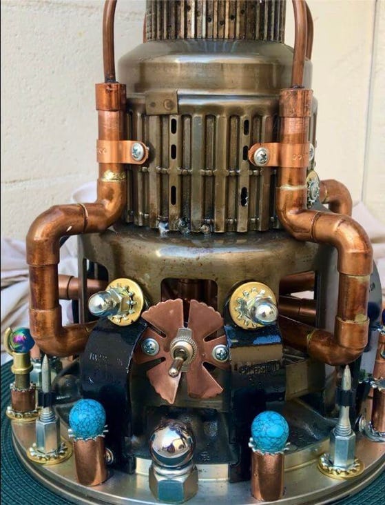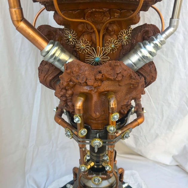 The Visionary Lamp has a unique history. At the turn of the century, there were the Punk Wars, when the Steampunkers and surrounding communities united together to rebel against the oppressive Dark Empire. The Dark Empire wanted to eliminate the Punk community and steal their Advanced Steampunk Technology so as to increase their power and dominion over the world. It was because of this Advanced Steampunk Technology the that the Dark Empire took a severe beating and were defeated. However, it came with a heavy cost to the Punkers. The Dark Empire captured many of the Punkers visionaries, artists, scientists and spiritual leaders, and executed them with the guillotine. The Steampunkers retrieved many of the heads of state, so to speak, and merged them with machines to keep them alive. This particular artist visionary was able to continue having visions of artistry, and with Advanced Steampunk Technology, manifested these visions into ornaments and “Steampunk Bling”. Keep in mind that this piece is first and foremost a fine-arts sculpture. As well it is a unique one-of-a-kind functioning lamp.
