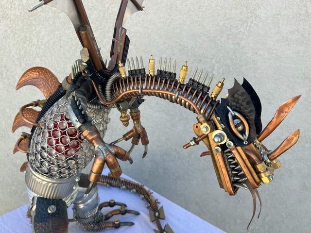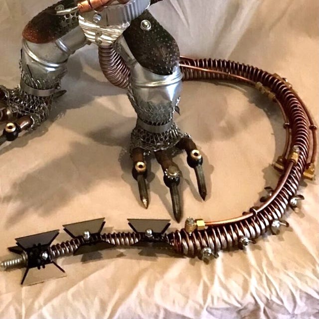 Dragon Punk was the second piece I created and really set the tempo for the next 20 pieces I designed and made. I got to see just how influential repurposed materials can be in setting the tone for design. I am often asked if I draw these designs out before I start building. The answer is no. I will often let the materials I find dictate how a particular sculpture morphs into existence. The Lawnmower Lamp, for instance, came about with me starting with a lawnmower blade and letting it inspired me to build a lamp with it. The Scorpion Punk came about with the finding of a piece of 1 inch rebar bent in the shape of a hook, and I immediately saw a scorpion tail. The rest was history. The other route I go is deciding for instance, I want to build a mandalorian speeder bike, and go in search of parts to design and build it. In a way drawings could be to restricting. You don’t want to stifle the creative spontaneous flow of design.