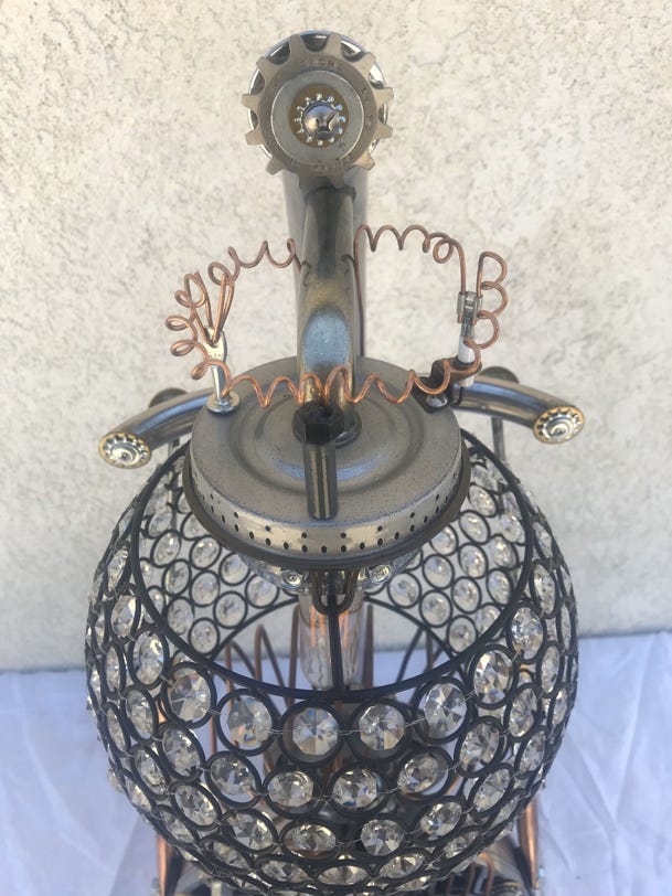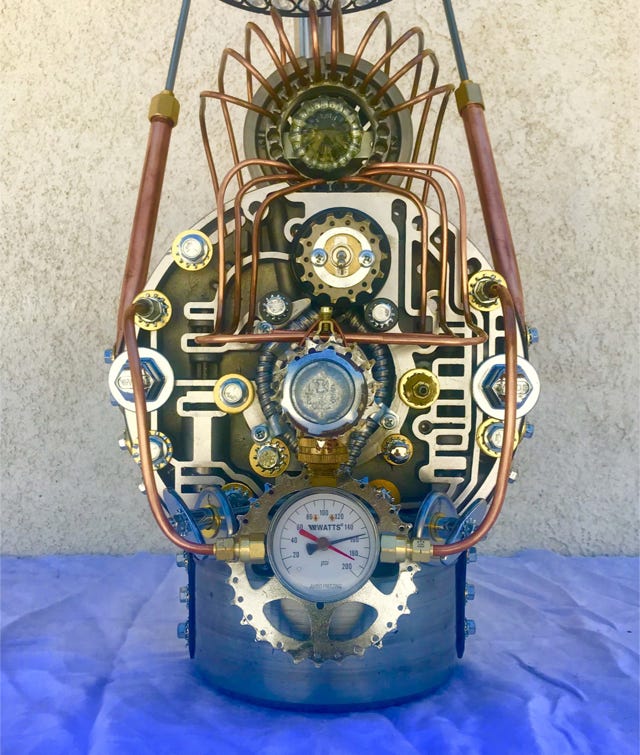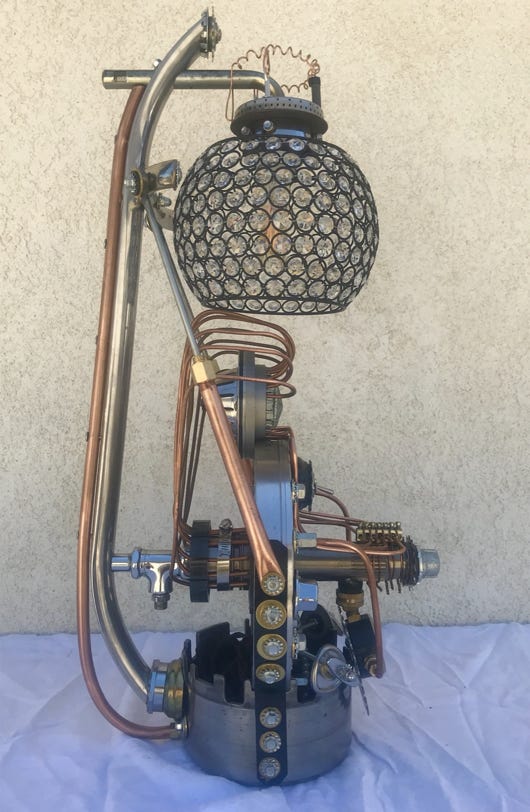 The Electric Punk Light sculpture of course is a lamp with a heavy electrical theme to it. As it is with all of my sculptures, most of the art supplies used are repurposed materials. This lamp is powered by Pure Light Energy and of course would only work for a follower of The Lord of Light. Keep in mind this piece is first and foremost a fine-arts sculpture. It also doubles as a unique one-of-a-kind functioning lamp.