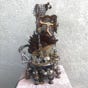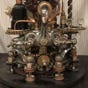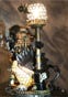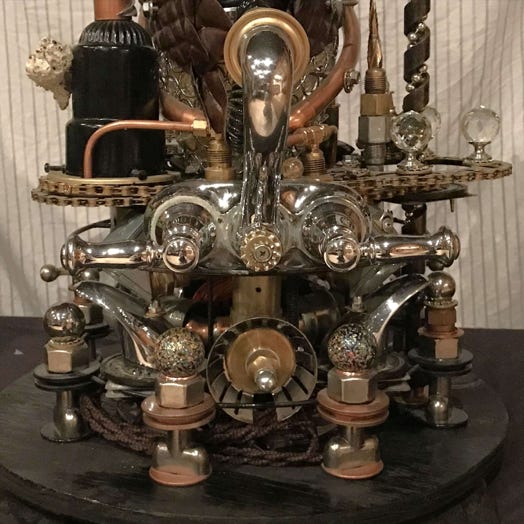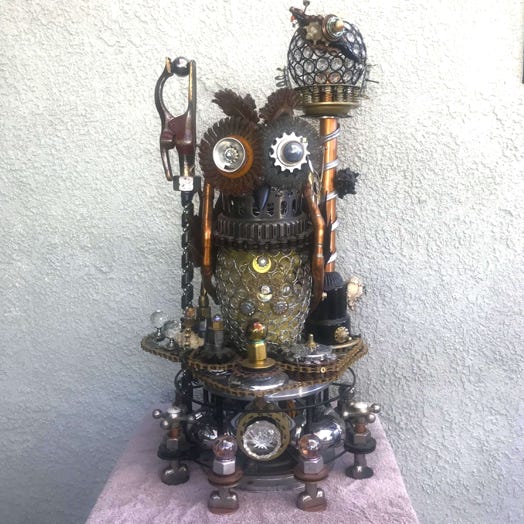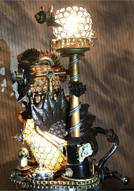 This is Owl Punk. She is a spy drone, similar to The Silver Swan. Both were key in the victory for the Punk resistance in the Punk Wars at the turn of the century. The Steampunkers and the rest of the Kingdom of the Lord of Light united together to fight back the oppressive Dark Empire that was attempting to exterminate the punk community and steel their Advanced Steampunk Technologies. You see Owl Punk here at his docking station, re-energizing with Pure Light Energy, while uploading and downloading critical mission information. The upper lamp is a homing devise for Owl Punk and the staff on the left is a Pure Light Energy Blaster, (PLEB), which he uses for defense and offense. See more info on the Pure Light Energy Blaster sculpture.. This piece is first and foremost a fine arts sculpture. As well it is a unique one-of-a-kind functional two light lamp.