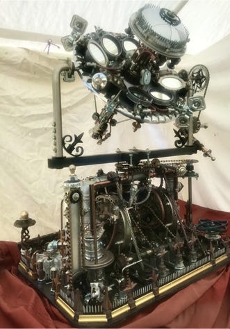 The Solar Powered Telescope is a marvel of Steampunk technology, totally self sufficient by means of solar power. Scaled to real life, it towers over 90 feet in height. It is a solar collector by day and an electronic telescope by night. It’s able to spin and rotate in all directions in order to capture everything above the horizon.The lower base section is the battery storage unit and all the machinery needed to operate the solar collector and telescope. It’s equipped with a lighting rod tower that not only attracts lightning bolts away from the telescope, but it absorbs the lightning strikes and stores the power in high capacity storage cells. An elevator is used to bring the star gazers and equipment up to the upper portion of this structure. For the record, the gear, chain, and axle work on this piece was one of the most challenging jobs I’ve had to face so far. Coordinating 4 gears, 2 chains, and an axle rod by hand is a bit more complicated than manufacturing and assembling 2 gear sprockets and 1 chain on a bike. I actually had to design and make chain tensioners to deal with chain slack. If it wasn’t so much fun I would be complaining.
